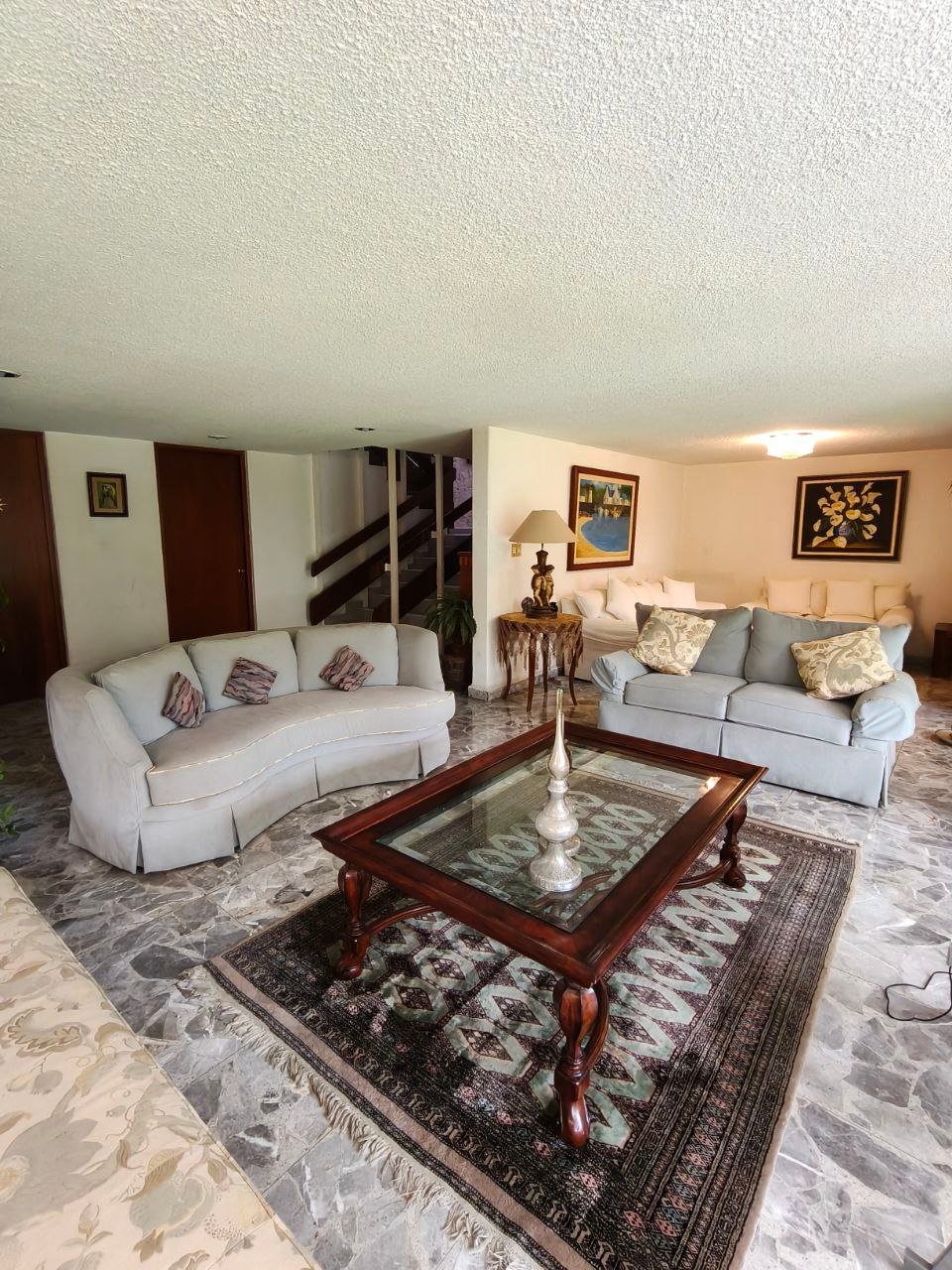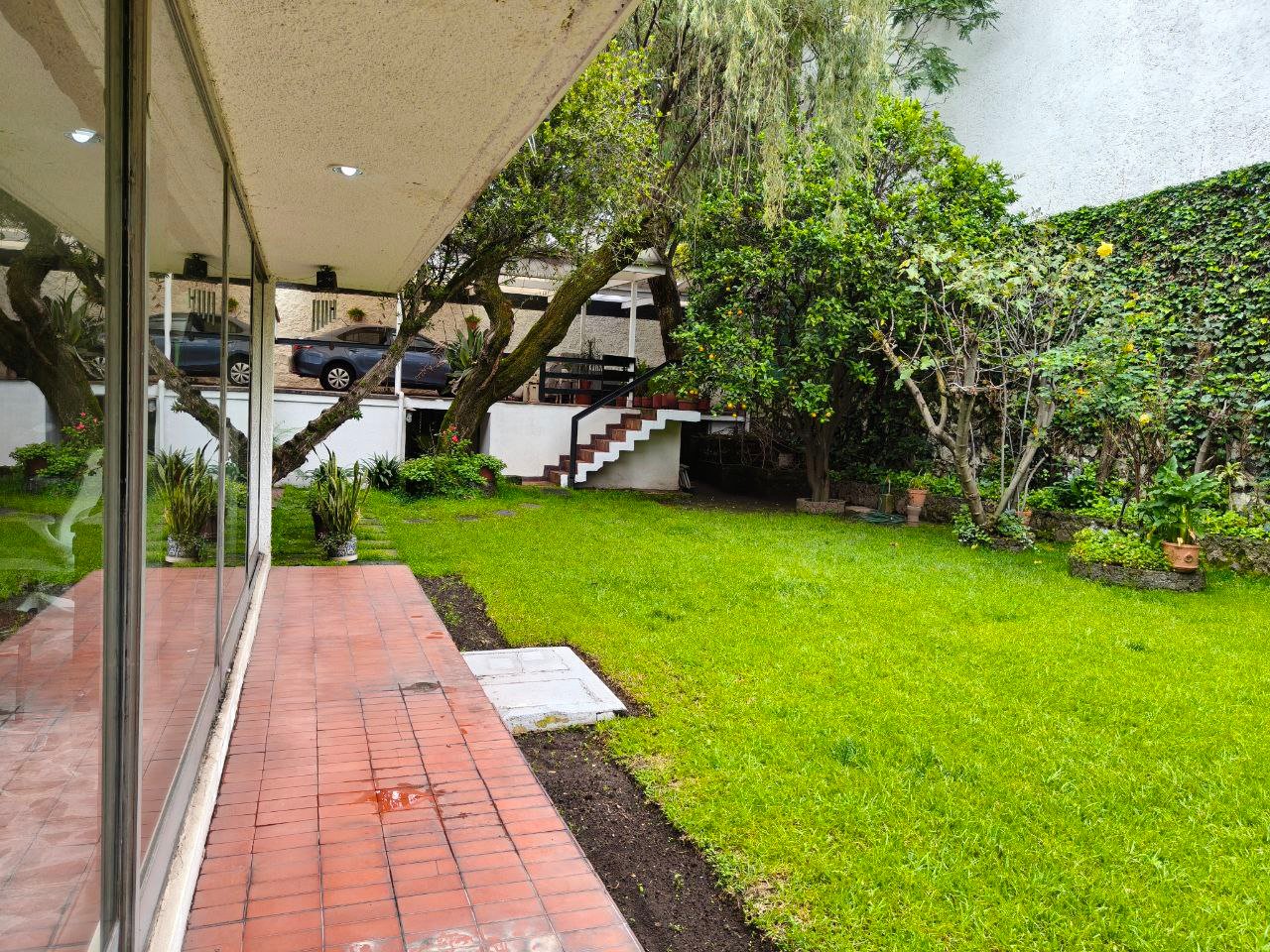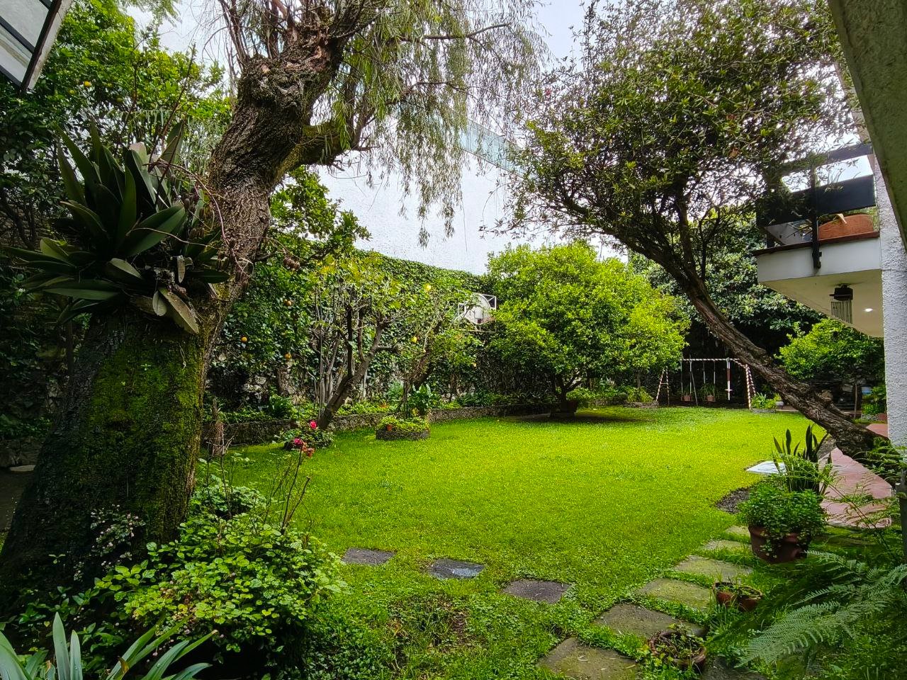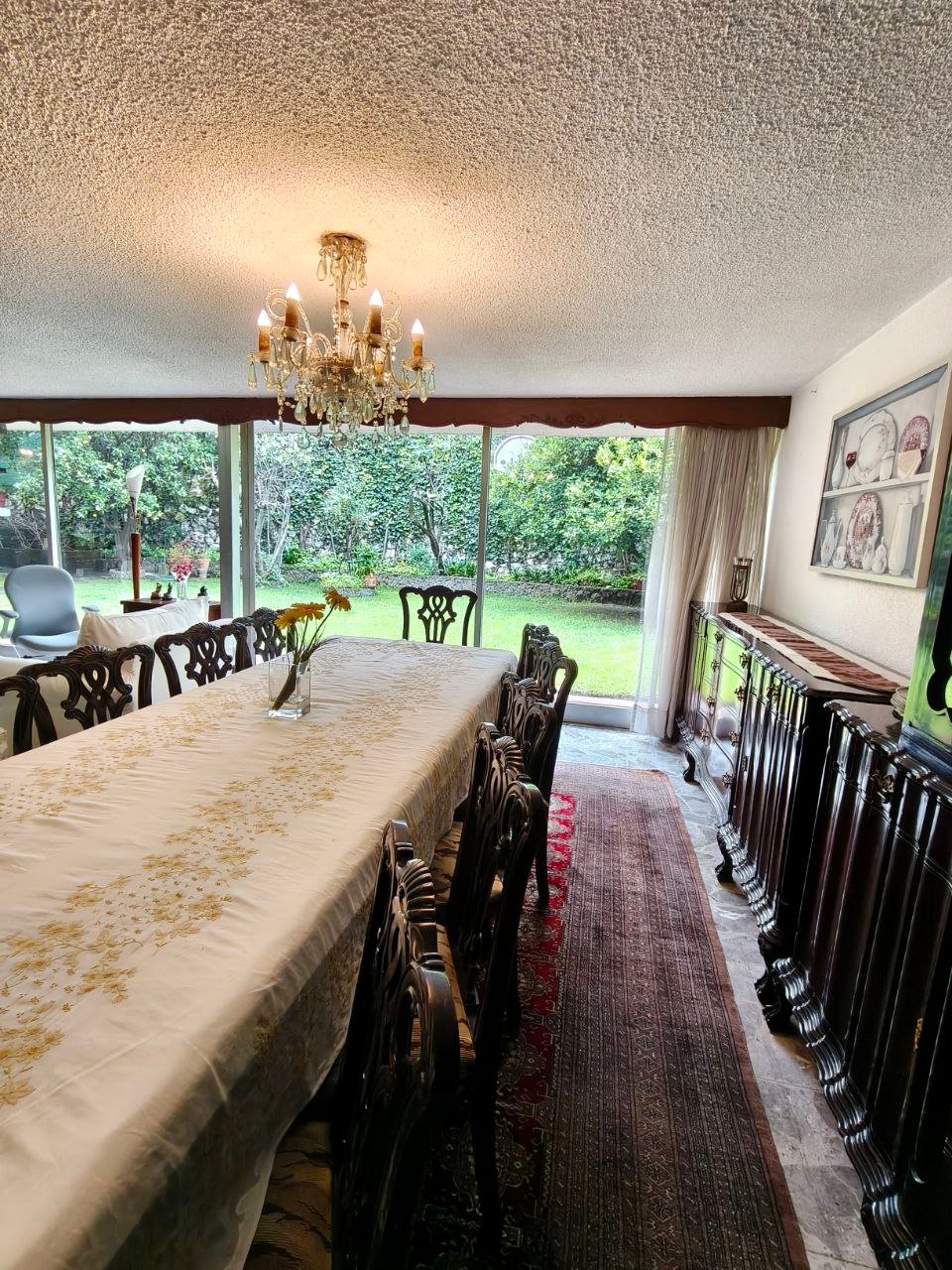 zona social formal, pasillo distribuidor, estudio, closet y 1/2 baño visitas, antesala, sala y comedor (todos con vista y salida a jardín), gran cocina integral con barra y desayunador, dos cuartos alacena con salida a patio interno de servicio y paso a jardín; de vestíbulo paso al área de estar o T.V., con acceso directo a 4 recámaras; 3 con closet baño cada una, la principal amplia con zona de estar, balcón, vestidor y baño. Exteriores; estacionamiento cubierto para 7 autos, gran bodega, cuarto mozo con baño, jardín en parte posterior, construcción anexa; cuarto de lavado y planchado, cuarto de servicio con baño, cuarto para huéspedes, con closet y baño.