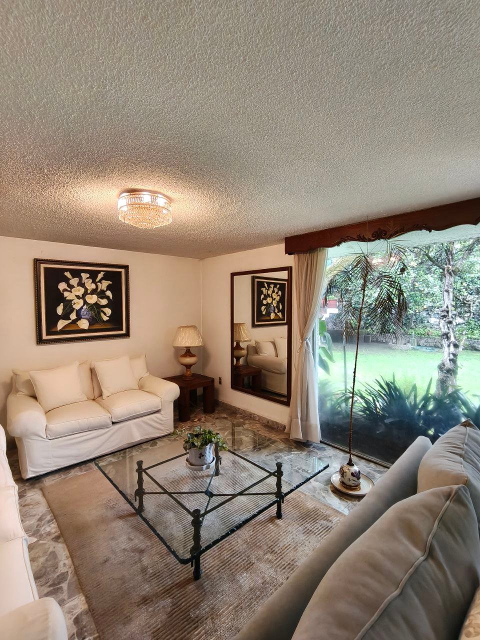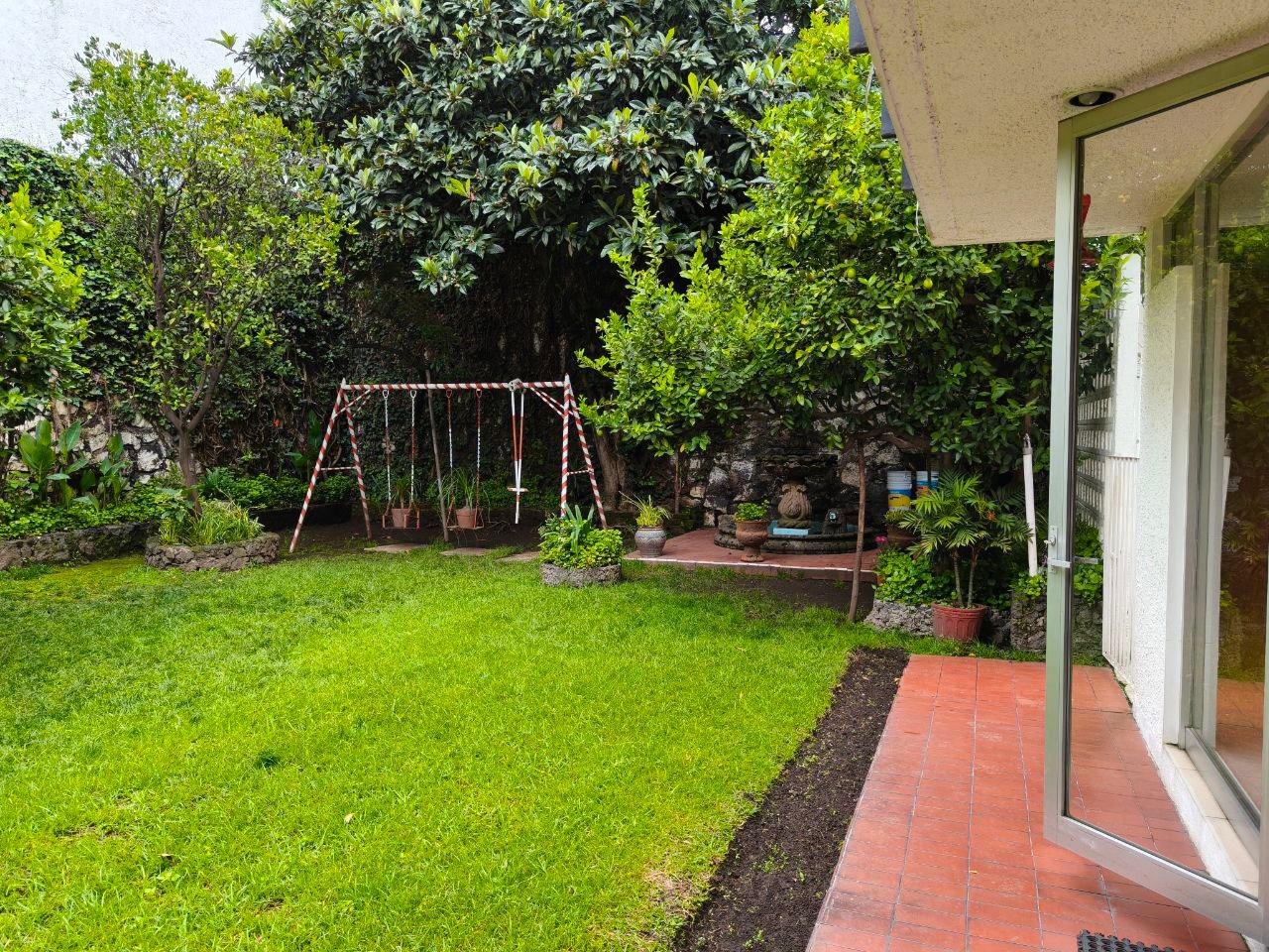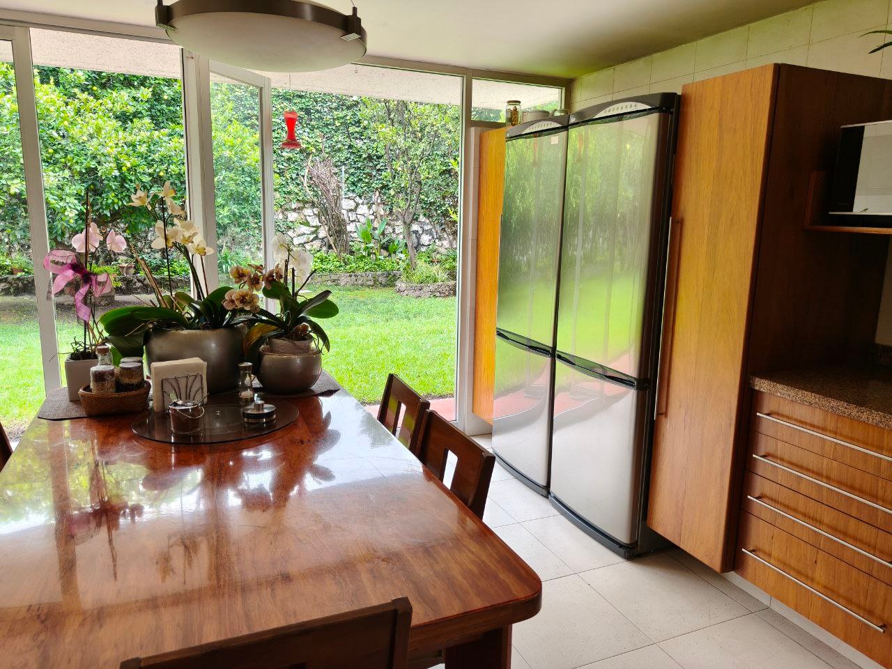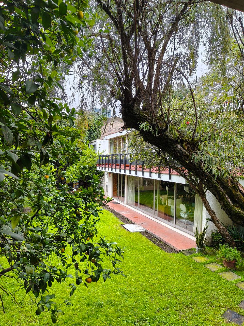 zona social formal, pasillo distribuidor, estudio, closet y 1/2 baño visitas, antesala, sala y comedor (todos con vista y salida a jardín), gran cocina integral con barra y desayunador, dos cuartos alacena con salida a patio interno de servicio y paso a jardín; de vestíbulo paso al área de estar o T.V., con acceso directo a 4 recámaras; 3 con closet baño cada una, la principal amplia con zona de estar, balcón, vestidor y baño. Exteriores; estacionamiento cubierto para 7 autos, gran bodega, cuarto mozo con baño, jardín en parte posterior, construcción anexa; cuarto de lavado y planchado, cuarto de servicio con baño, cuarto para huéspedes, con closet y baño.