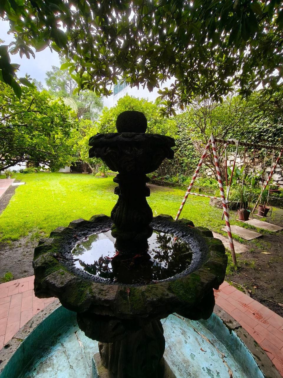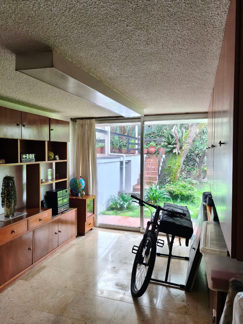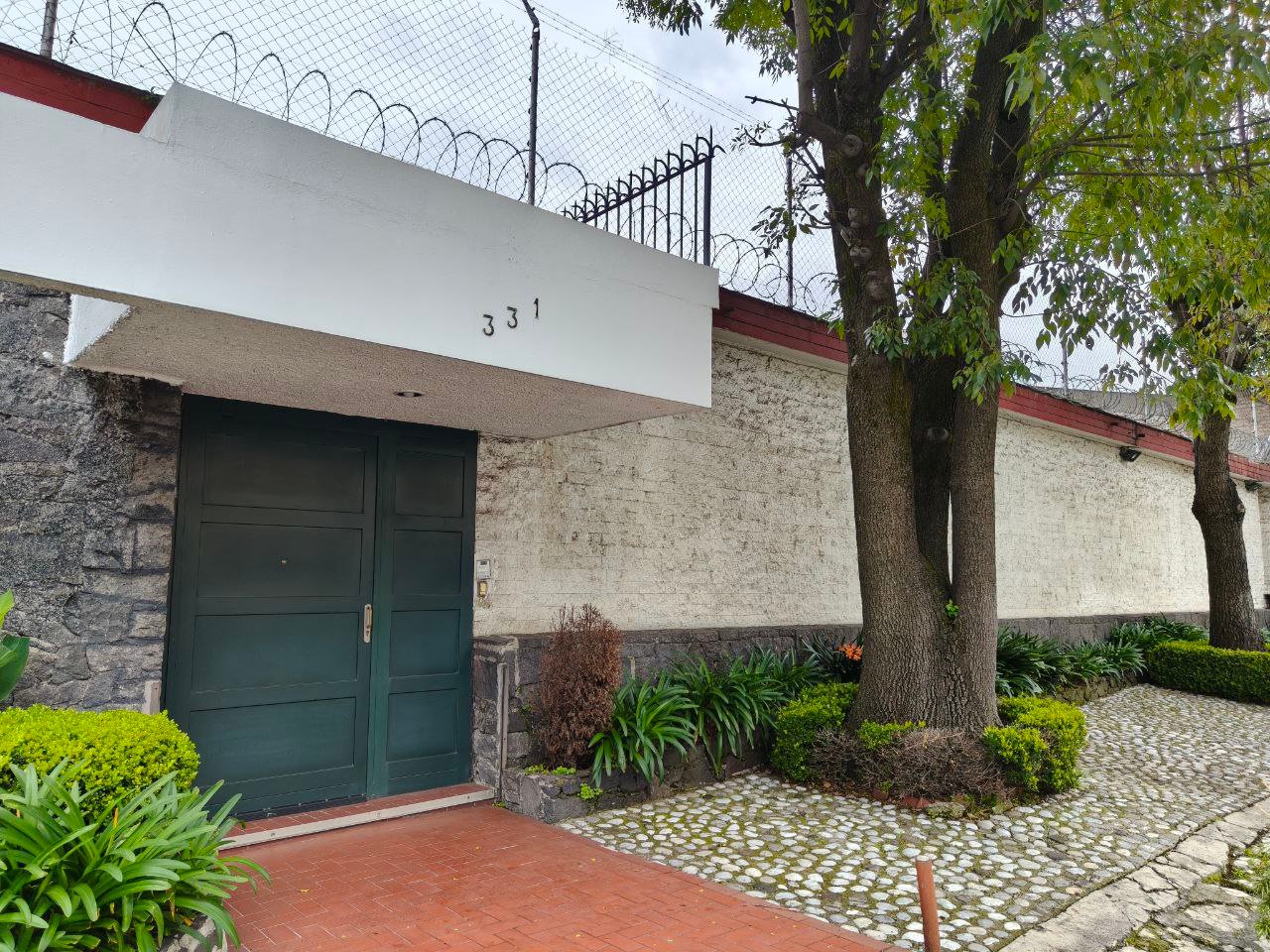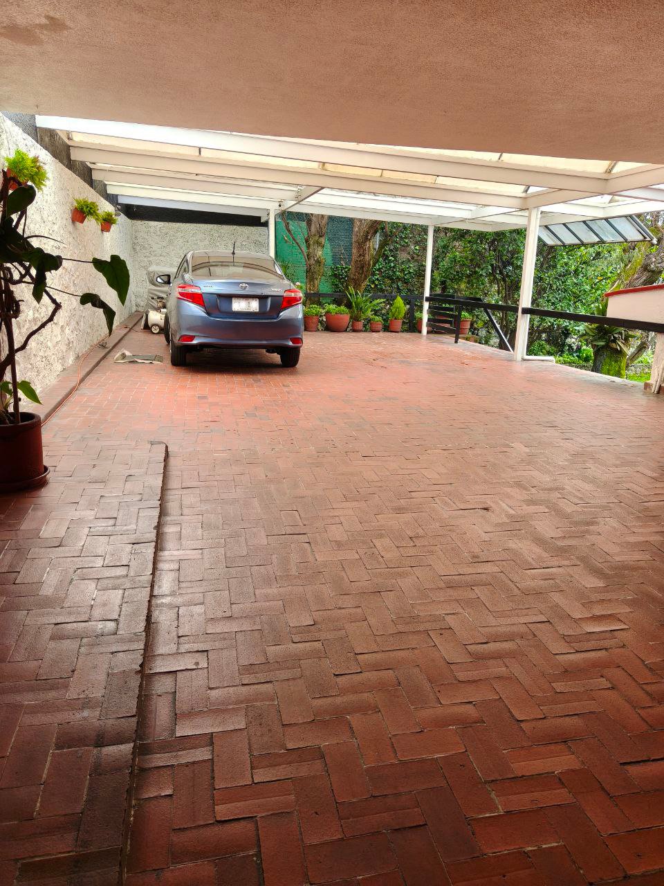 zona social formal, pasillo distribuidor, estudio, closet y 1/2 baño visitas, antesala, sala y comedor (todos con vista y salida a jardín), gran cocina integral con barra y desayunador, dos cuartos alacena con salida a patio interno de servicio y paso a jardín; de vestíbulo paso al área de estar o T.V., con acceso directo a 4 recámaras; 3 con closet baño cada una, la principal amplia con zona de estar, balcón, vestidor y baño. Exteriores; estacionamiento cubierto para 7 autos, gran bodega, cuarto mozo con baño, jardín en parte posterior, construcción anexa; cuarto de lavado y planchado, cuarto de servicio con baño, cuarto para huéspedes, con closet y baño.